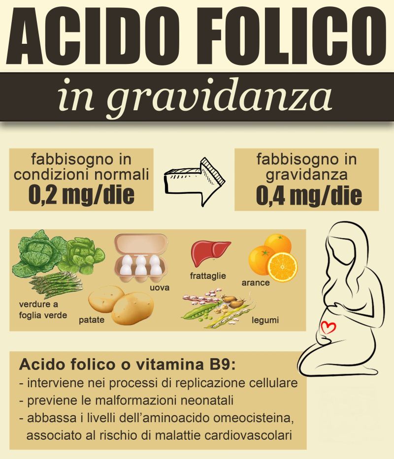 L’acido folico è necessario per la produzione dei globuli rossi e per prevenire alcune forme di anemia, oltre che malformazioni al feto. Esso è un elemento essenziale per lo sviluppo del condotto neurale che si forma dopo il concepimento e diventa poi la colonna vertebrale del neonato. Una carenza di acido folico può comportare malformazioni a livello di tubo neurale, come per esempio la spina bifida. Ma può comportare malformazioni anche ad altri parti del corpo, come al cranio e all’apparato cardiovascolare.